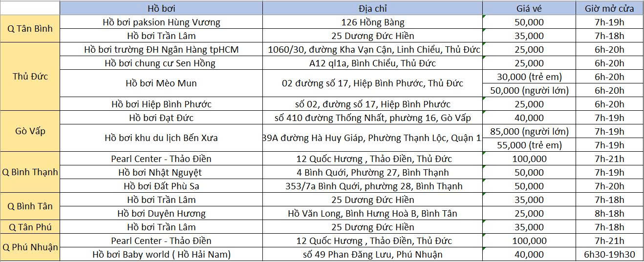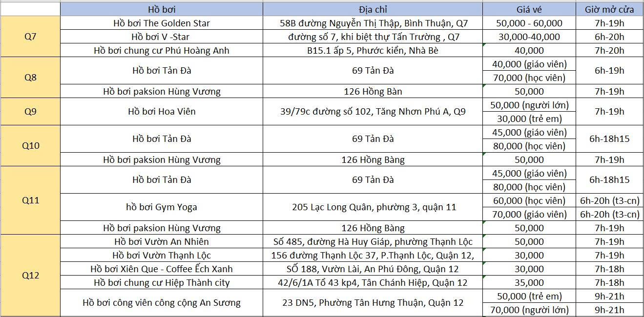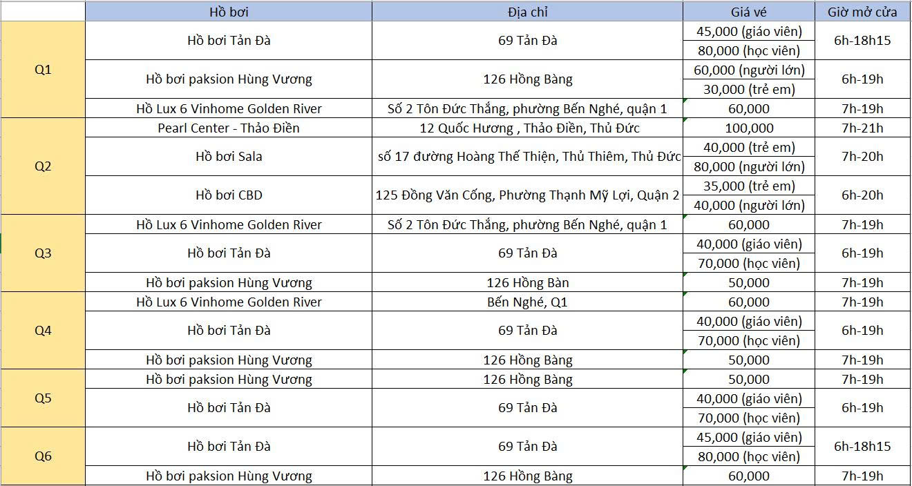 Học viên vui lòng tham khảo danh sách hồ bơi bên dưới và chọn địa điểm phù hợp với khu vực sinh sống để việc học diễn ra thuận lợi hơn