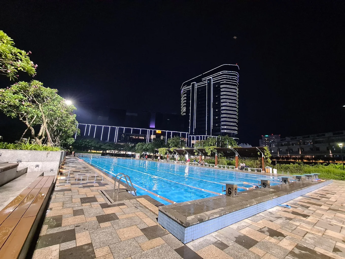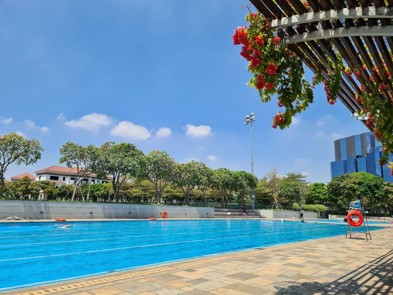 Xung quanh hồ bơi được bao phủ bởi hàng cây xanh mát, tạo không gian thoáng đãng và trong lành. Hệ thống ánh sáng hiện đại cho phép bơi cả vào buổi tối, đảm bảo an toàn tối đa cho người sử dụng.